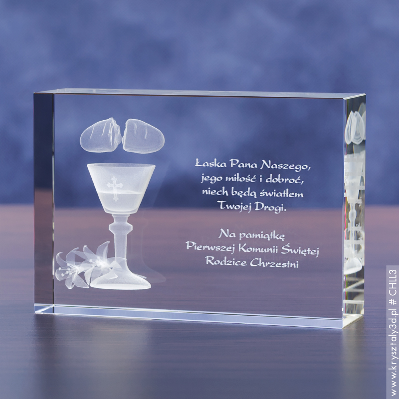Pamiątka Pierwszej Komunii Świętej z efektownym grawerunkiem 3D kielicha w otoczeniu lilii, nad którym unosi się przełamany chleb - symbol Ciała Bożego. Dodaj do niej własny tekst życzeń i stwórz ...